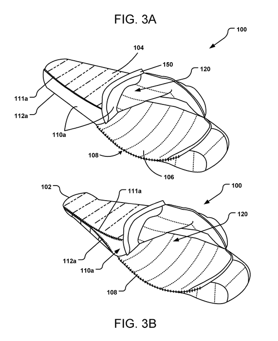 - Les panneaux s’ouvrent via des fermetures éclair (111, 112) pour élargir le sac (ex. : +5 à +12 cm de circonférence), offrant plus d’espace pour les épaules, les hanches ou les pieds.