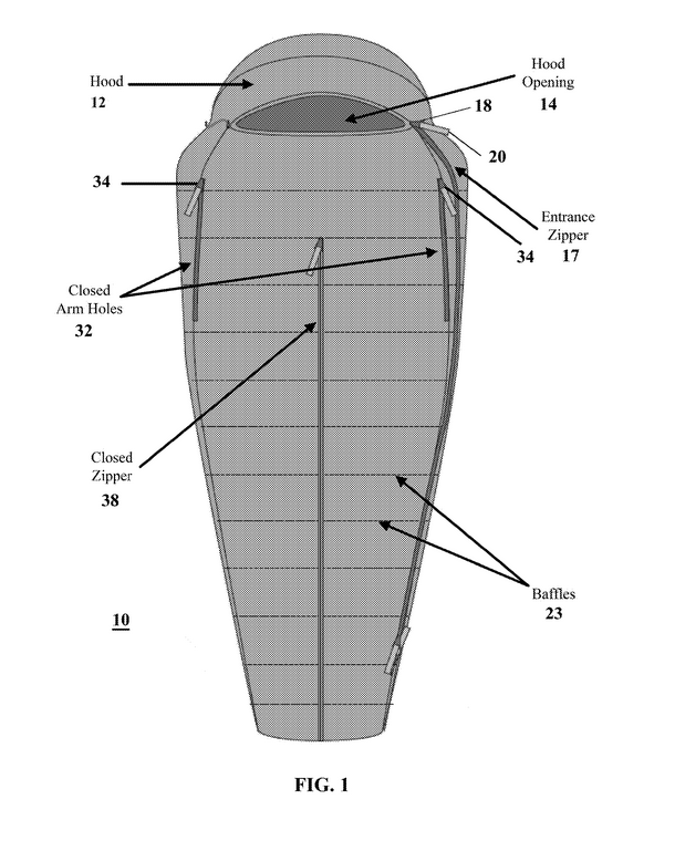 Ce brevet présente un sac de couchage modulable avec un panneau extensible triangulaire (36) sur le dessus, permettant de :
